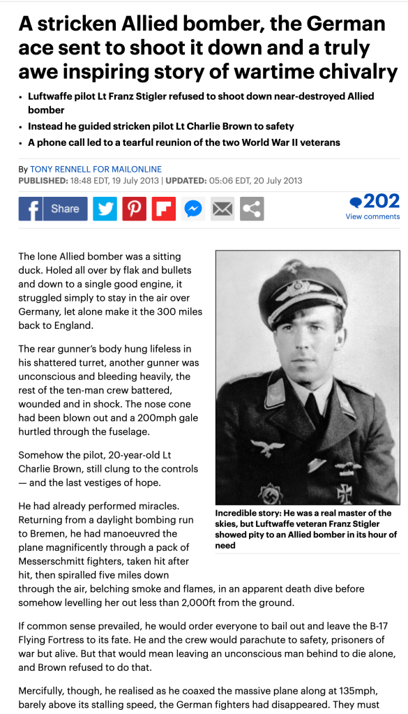 It wasn’t long before Franz Stigler’s Bf109 was spotted approaching at speed; all on board believed their days were now finally numbered. But Luftwaffe Ace Stigler had other thoughts.