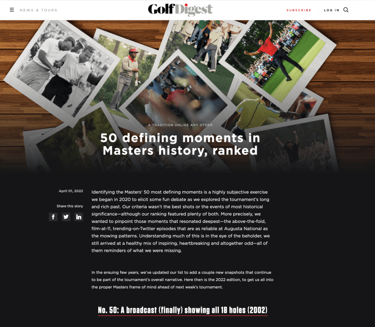 The article is titled, “50 Defining Moments in Masters History, Ranked” and ranked . . . .