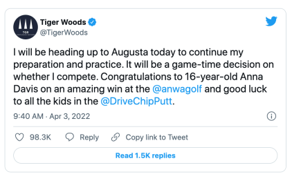 “Tiger Woods announced Sunday that he continues to prepare for the 2022 Masters with his participation in the tournament ultimately being a “game-time decision”. Woods, who was involved on a horrific one-car wreck in February 2021, is aiming to play his first official event since November 2020 when he last participated in a Masters delayed amid the COVID-19 pandemic.” [1]