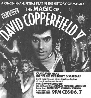 - “Copperfield had a setup of 2 towers onstage, supporting an arch to hold the big curtain used for concealing the statue. The TV cameras, as well as the live audience, were only able to see the monument through the arch.” [1]