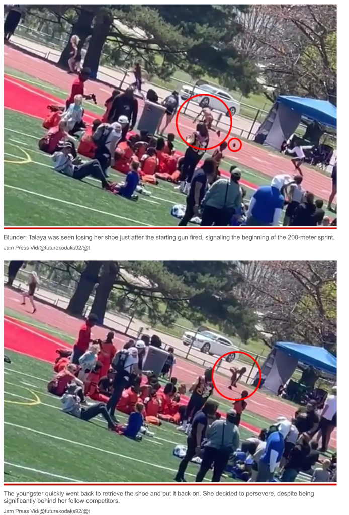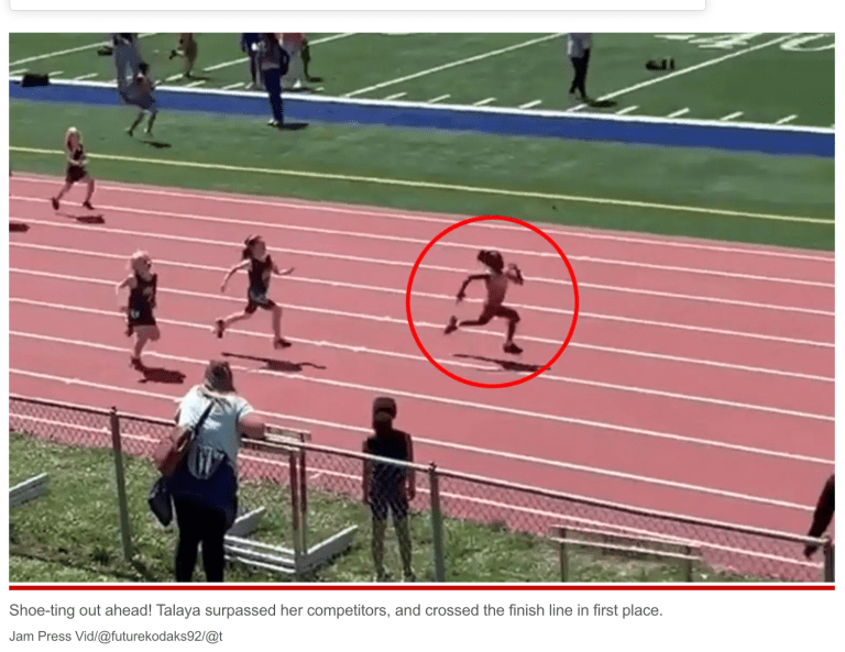 Talaya’s running coach, Shunta Paul, told Omaha.com that the youngster was “embarrassed” by the blunder, and that she has promised to make sure her shoelaces are tightly tied before the beginning of every future race.