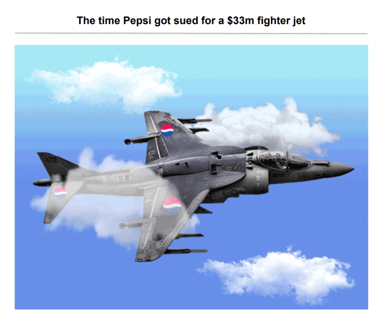 1. See “The Time Pepsi Got Sued For A $33m Fighter Jet,” by Zachary Crockett, for the content of this account and more.