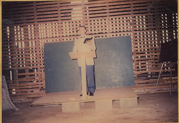 (Pastor Richard Nelson, preaching in the farm building that became the first sanctuary)